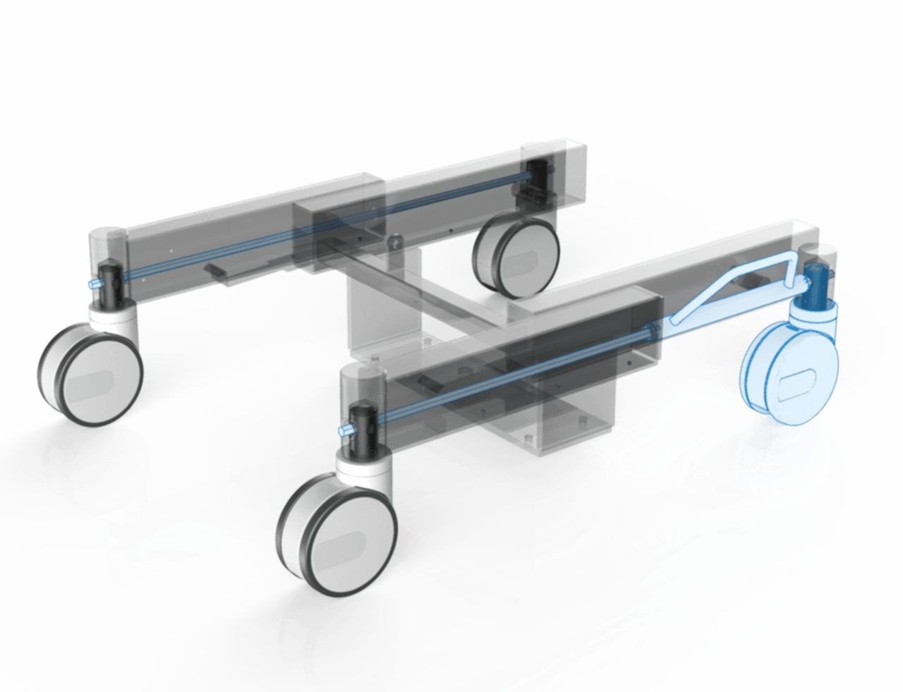 Châssis en acier de précision avec quatre roulettes doubles entièrement pivotantes et une aide mécanique à la manœuvre « Steering Guide », offrant d’excellentes caractéristiques de déplacement ainsi qu’un déplacement facile et ergonomique par une seule personne.