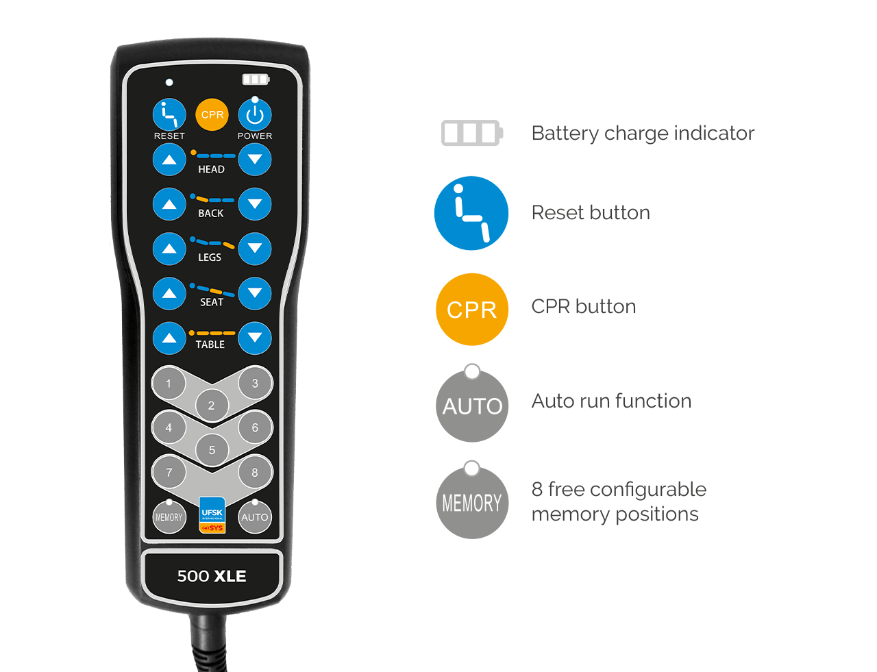 La commande manuelle multifonction avec huit positions de mémoire, fonction de déplacement automatique, bouton de réinitialisation, bouton CPR et indicateur de charge de la batterie garantit des conditions de travail agréables avant, pendant et après l’intervention.