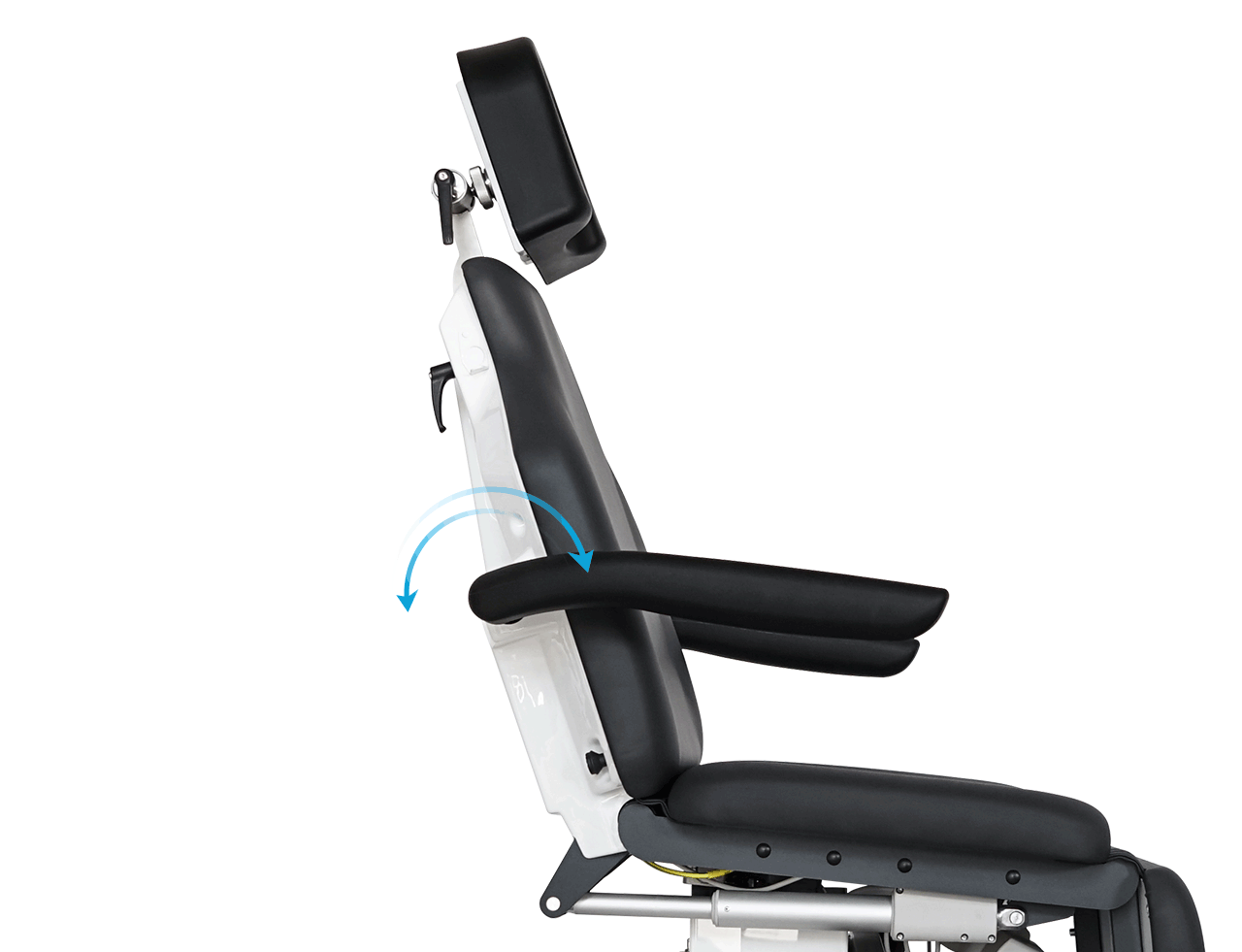 - Accoudoirs amovibles avec poignées de poussée intégrées pour faciliter la manœuvre et le repositionnement du patient.